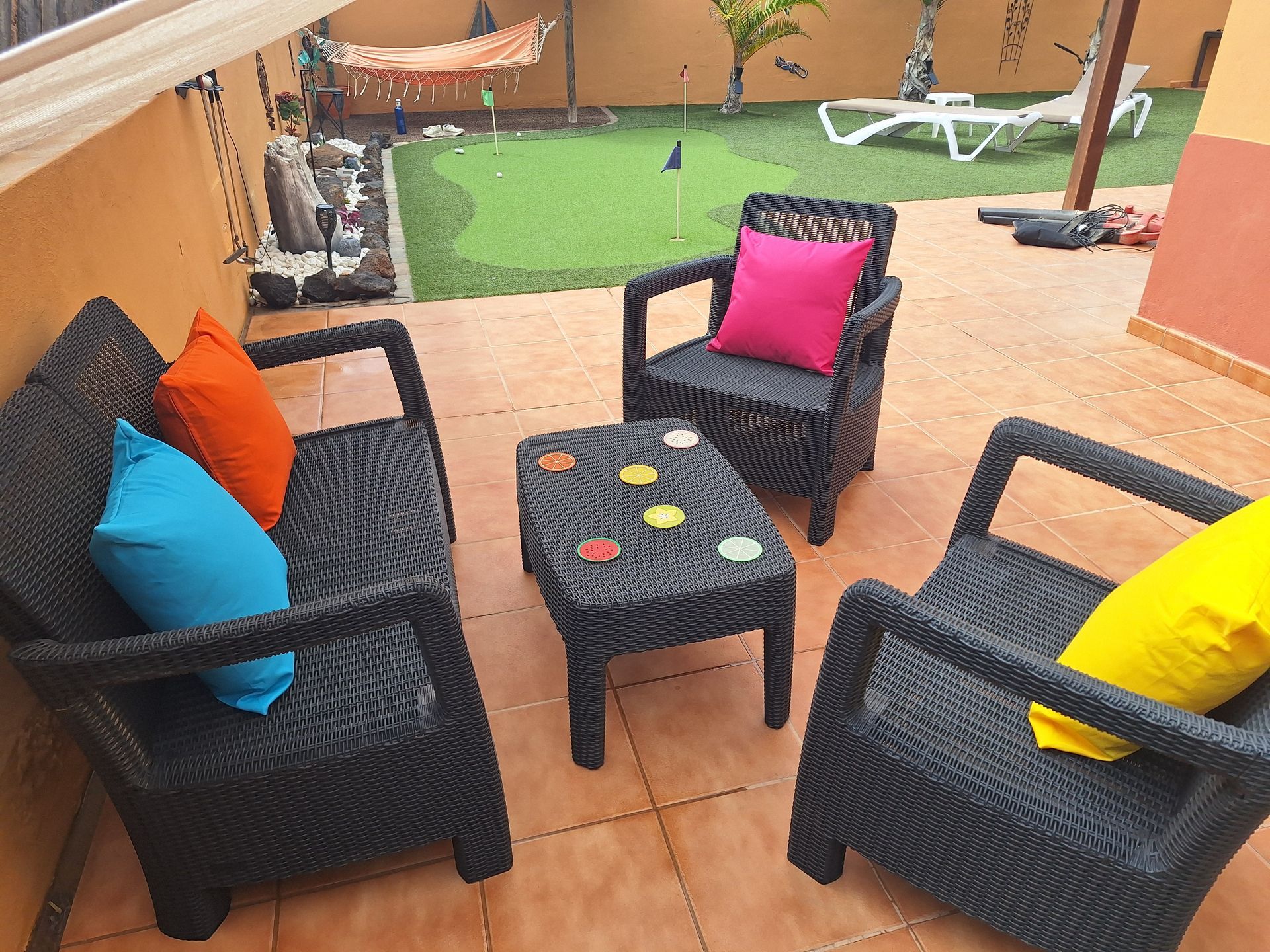 Large private sunny garden, gated on both sides making it very safe for children. A hammock under a "coconut umbrella" makes a perfect area for chilling out. There are six sun loungers for guests to enjoy.