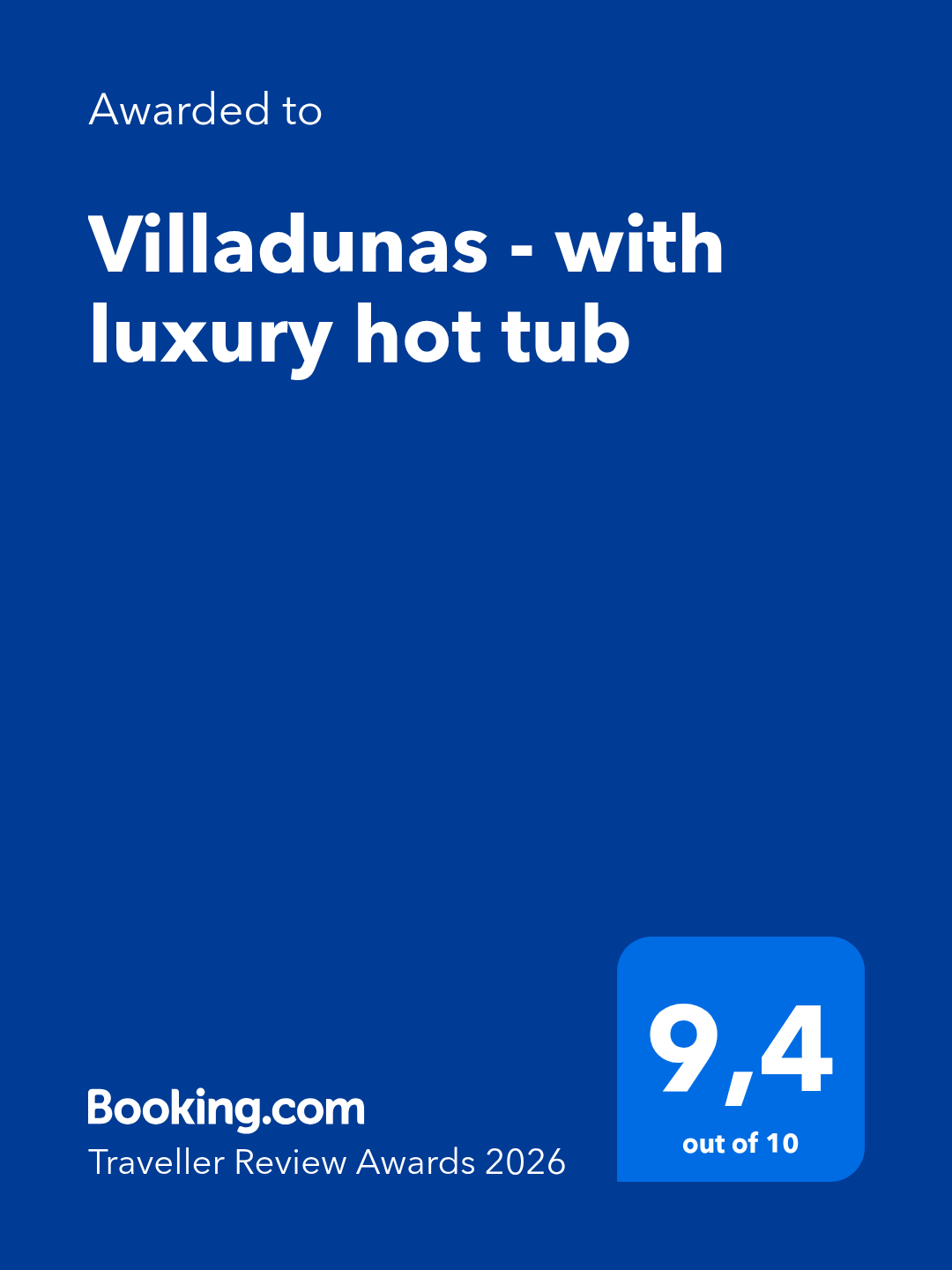 Thank you for a lovely stay in your villa. Loved the roof terrace with the fantastic views. Also the putting green and hot tub. Already booked to come back!